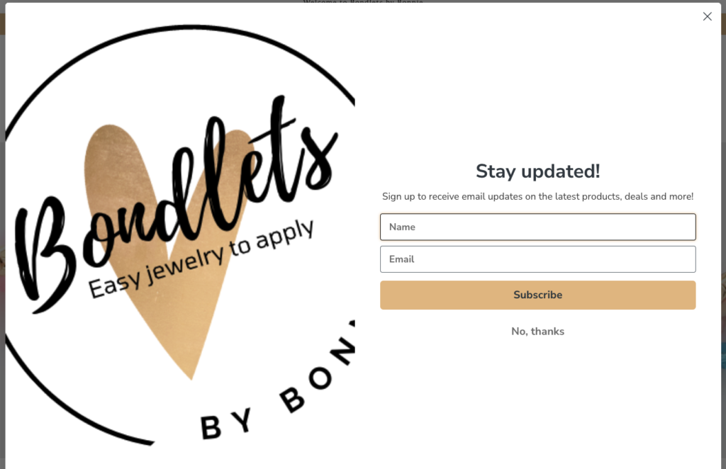 Bondlets subscription popup made with Klayvio, when a user escapes the popup, they are able to easily access it again if whenever they want if they decide to subscribe.