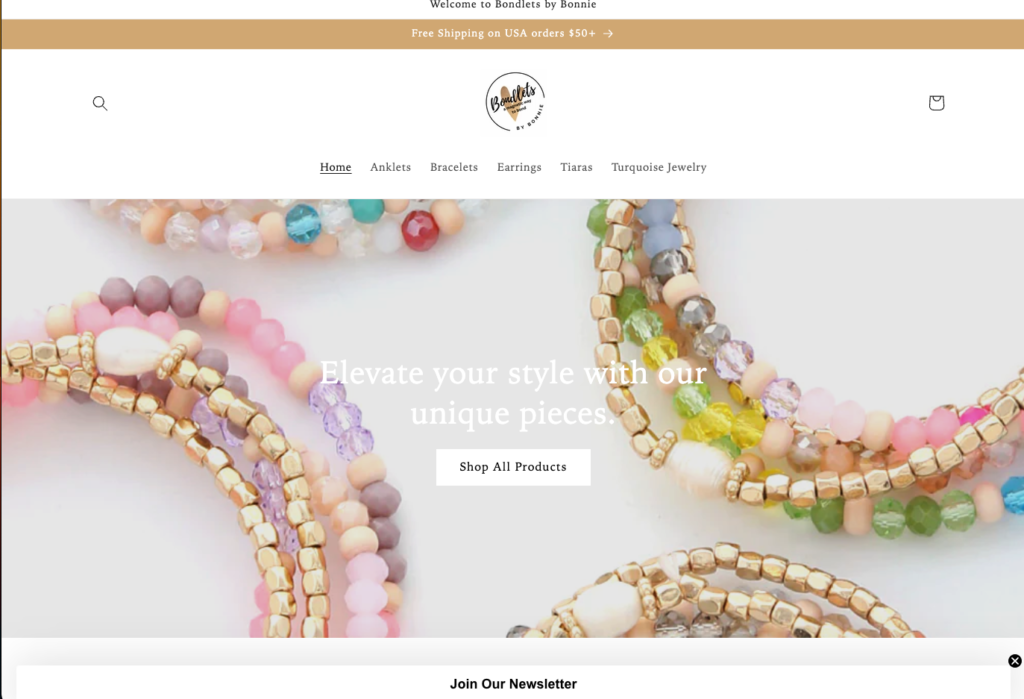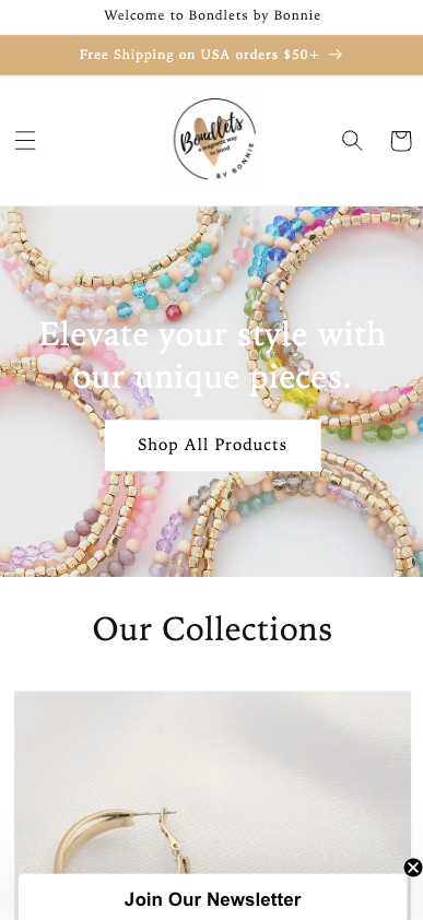 Bondlets is a custom jewelry storefront. As mentioned before, I was essentially give a blank slate beyond what Shopify template she wanted to use, and her expectations for UI and UX. So, to start, in order to help optimize site speed and thus the user experience, I optimized and compressed assets. Once those were taken care of, following along with the template and my understanding of good user flow, I was able to create the website with relative ease and a good amount of time.