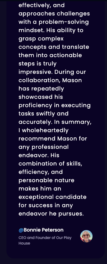 A small snippet of the testimonial Bonnie wrote for me from our work together on Bondlets and her other storefronts. View the whole testimony on my website